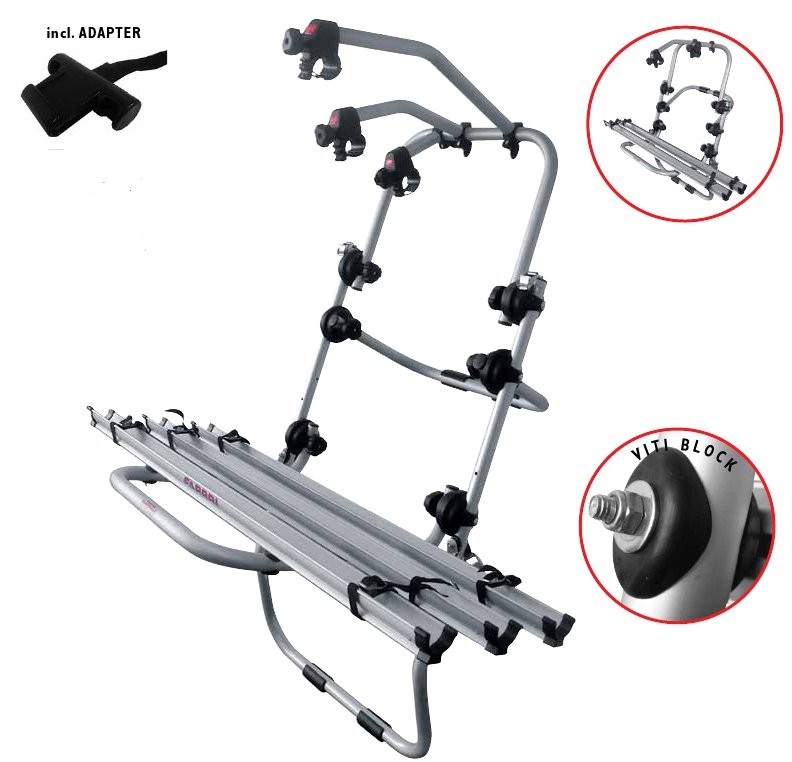 Bici Ok Van incl.Adapter: portabici posteriore per il trasporto per 2 o 3 biciclette realizzato per Monovolume e Station Wagon con portellone più grande così come per versioni con spoiler, lunotti divetro o paraurti in plastica – Regolabile in altezza per evitare la copertura della targa- Realizzato in alluminio elettrosaldato = tripla robustezza = garanzia di un’assoluta sicurezza anche in situazioni estreme per il trasporto fino a 3 bici- Richiudibile quando viaggia a vuoto (senza bici) = minor ingombro = maggiore sicurezza- Montaggio delle biciclette mediante bracci in alluminio rotanti di 360˚ con protezione gommata dei telai delle bici su robusti profili in alluminio- Con 6 snodi dentellati in ABS con doppio raggio per una perfetta tenuta anche su dossi stradali e strade sterrate- Con sistema “Viti Block” per la protezione dell’alluminio nel serraggio delle viti- Con 6 fibbie e 6 cinghie con ganci plastificati di alta qualità antigraffio o Adapter- Con 6 cinghietti e fibbiette robuste spessorati in gomma antigraffio per fissaggio ruote bici- Spessore telaio di ø 30-50 mm, con prolunga “Extra Long Cable Bici“ di ø 54-65 mm  o fissaggio al reggisella– Non copre la targa, non è quindi necessario l’acquisto di una targa ripetitrice