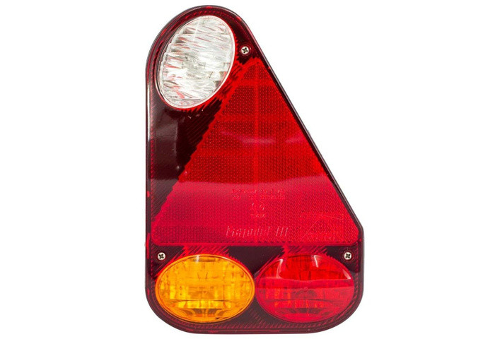 Fanale posteriore destro a lampadina 12V con funzione di posizione, stop, freccia, retromarcia e riflettente triangolare. Versione con connettore 5 poli Aspock